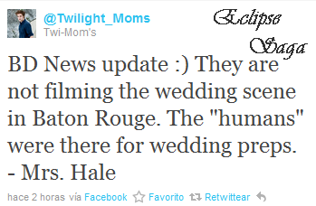 "Novidades de BD :) Eles ainda não filmaram a cena do casamento em Baton Rouge. Os "humanos" foram lá para as preparações do casamento. - Sra. Hale."